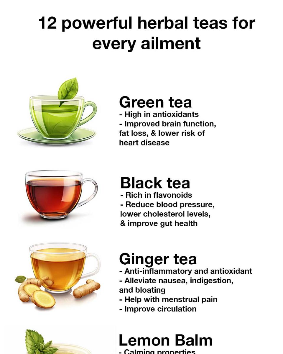 Herbal teas have been cherished for centuries across various cultures for their healing properties and delightful flavors. Unlike traditional teas made from the Camellia sinensis plant, herbal teas are infusions made from herbs, spices, flowers, and other plant materials. They are naturally caffeine-free and rich in a variety of beneficial compounds, making them an excellent choice for those seeking natural remedies for common ailments. From boosting the immune system to aiding digestion and promoting relaxation, herbal teas offer a wide range of health benefits. In this article, we will explore 12 powerful herbal teas and how they can help address different health concerns.