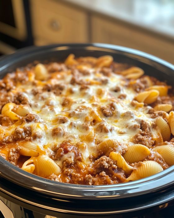 Slow Cooker Cheesy Beef and Shells